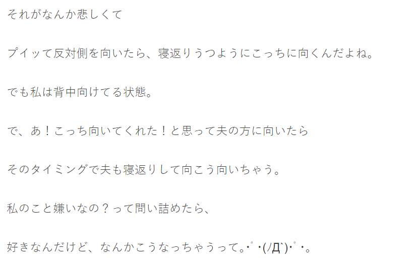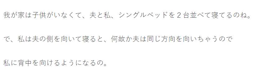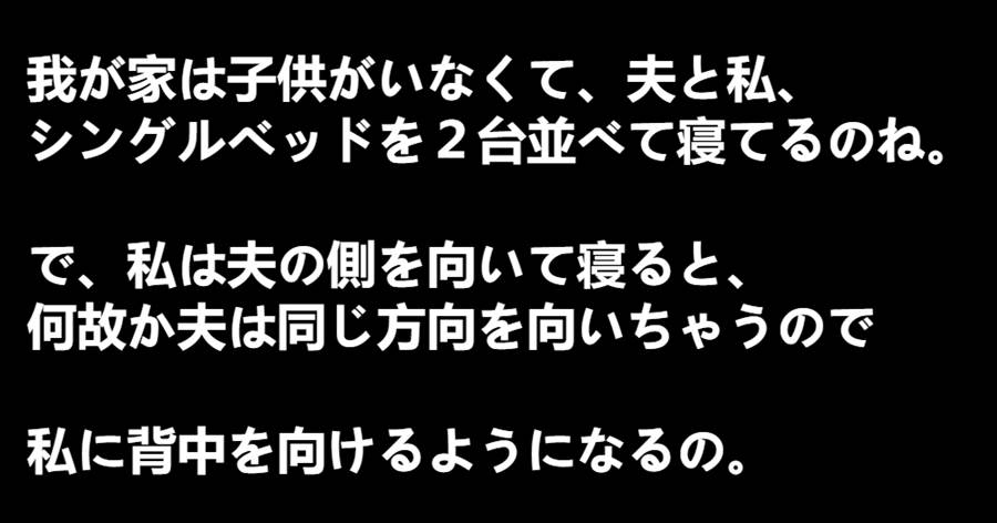 ベッドを2台並べて寝てる。 私が夫の側を向いて寝ると、何故か夫は私に背中を向ける。私「私のこと嫌いなの?」