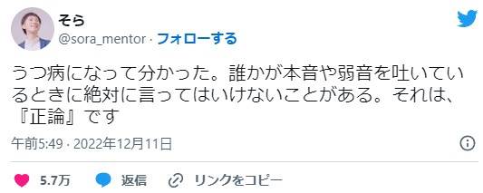 「誰かが本音や弱音を吐いているときに絶対に言ってはいけないこと」と投稿されたツイートが突き刺さります。