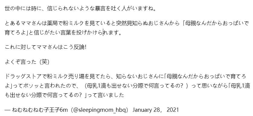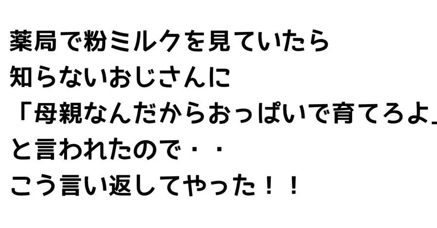 薬局で粉ミルクを見ていたら知らないおじさんに「母親なんだからおっぱいで育てろよ」と言われたので・・こう言い返してやった!!