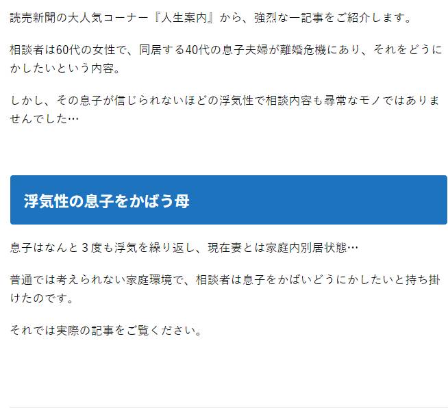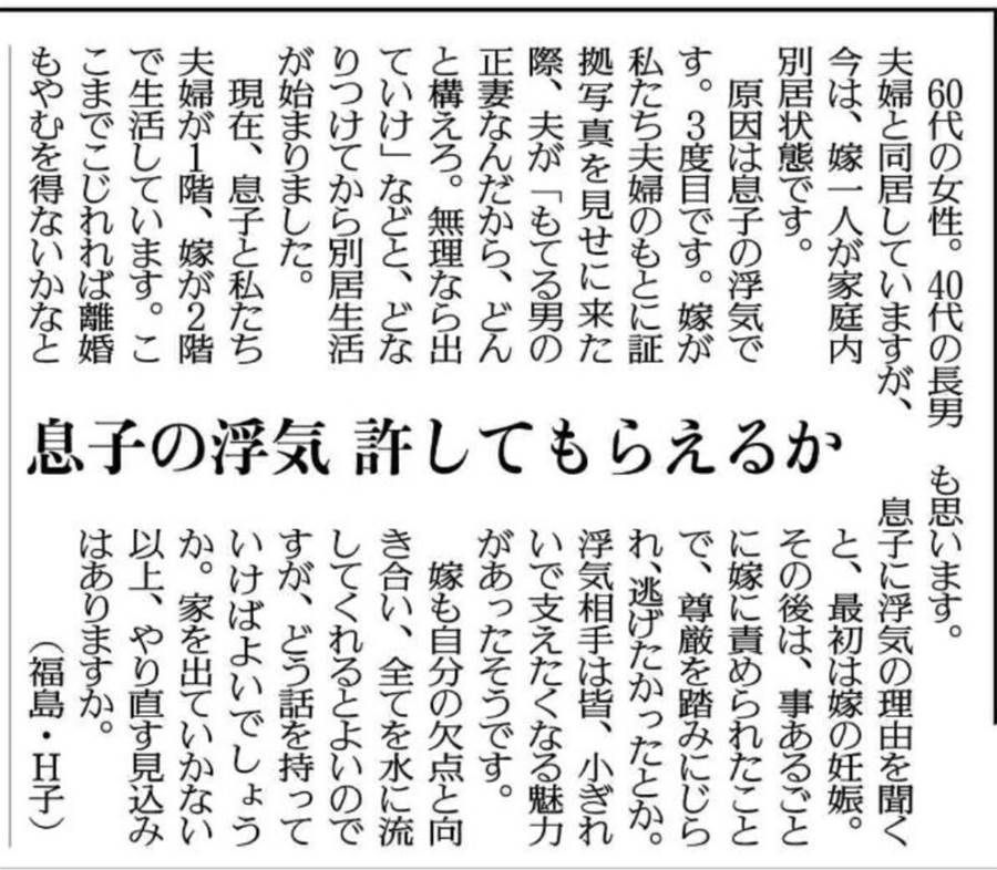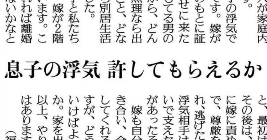 浮気性の息子を庇い相談を持ち掛ける60代母、アドバイザーの強烈カウンターに「正論」