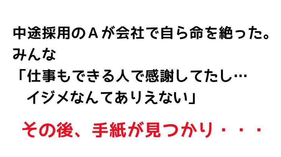 中途採用のAが会社で自ら命を絶った。みんな「仕事もできる人で感謝してたし…イジメなんてありえない」その後、手紙が見つかり・・・