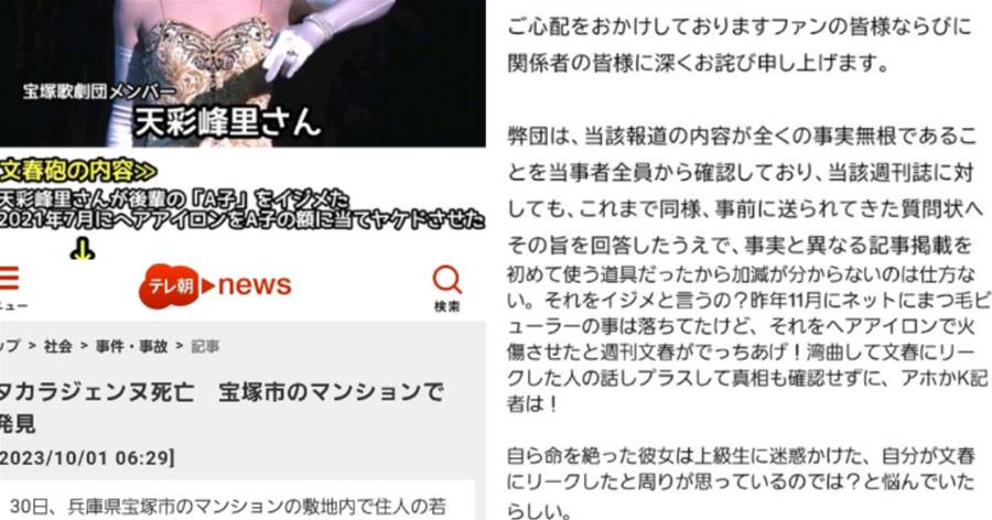 今年2月、文春が「宝塚内部のイジ〇で天彩峰里さんが後輩A子の額にヘアアイロンをあてヤケドさせた」と報道→宝塚歌劇団は「事実無根」と反論→文春記事内の情報から「A子=有愛きいさん」と特定される→元文春記者「自殺理由はイジメではなく、文春のデマ記事」