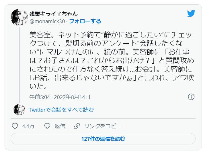 美容院のネット予約で『会話をしたくない』にマルをしたという投稿者さん。