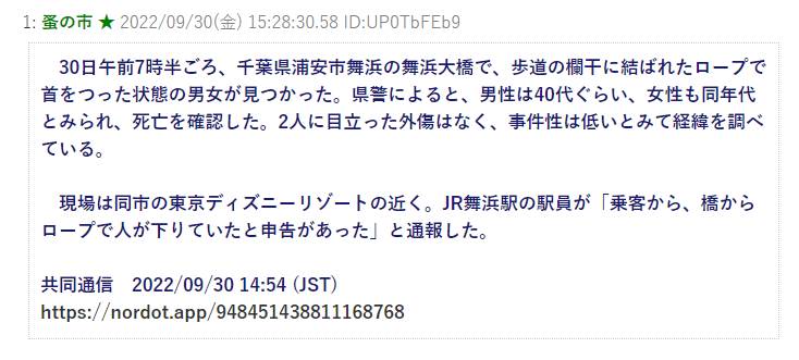 【訃報】ディズニー近くの橋、男女の変わり果てた姿が見つかる・・・