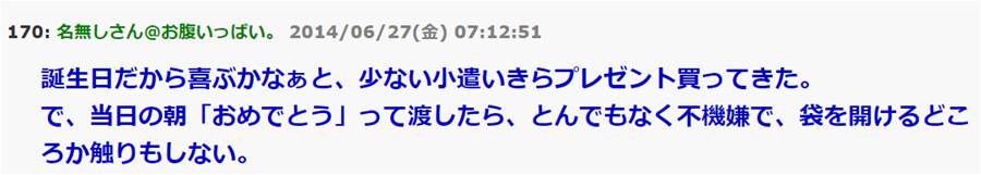 俺「誕生日おめでとう。はいプレゼント」嫁『…(不機嫌)』俺「?」 → 開けるどころか触りもせず、嫁『10年以上一緒にいてまだわからないの?』俺「えっ」
