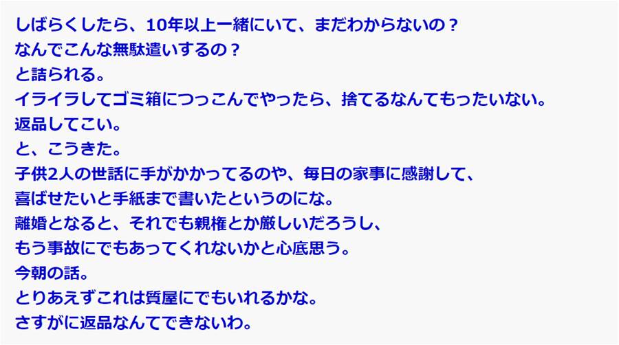 俺「誕生日おめでとう。はいプレゼント」嫁『…..(不機嫌)』俺「?」 → 開けるどころか触りもせず、嫁『10年以上一緒にいてまだわからないの?』俺「えっ」