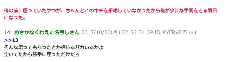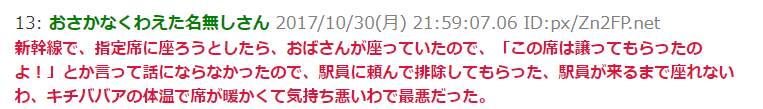 新幹線で。オバサン『この席は譲ってもらった!』俺「ここは俺の指定席です」→駅員『お客様、こちらは…』オバサン『!?』→俺(ちゃんとこのキチを拒絶しなかったせいだ…!)