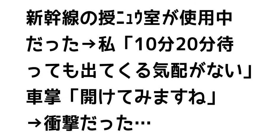新幹線の授ニュウ室が使用中だった→私「10分20分待っても出てくる気配がない」車掌「開けてみますね」→衝撃だった…