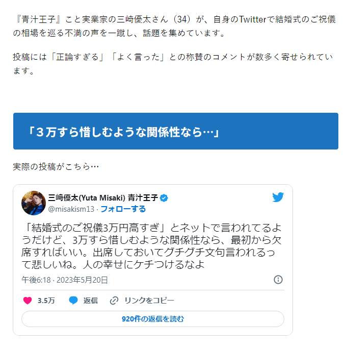 『結婚式、ご祝儀3万円は高すぎる』の不満に対し、青汁王子が返した正論に「ホントそれ」