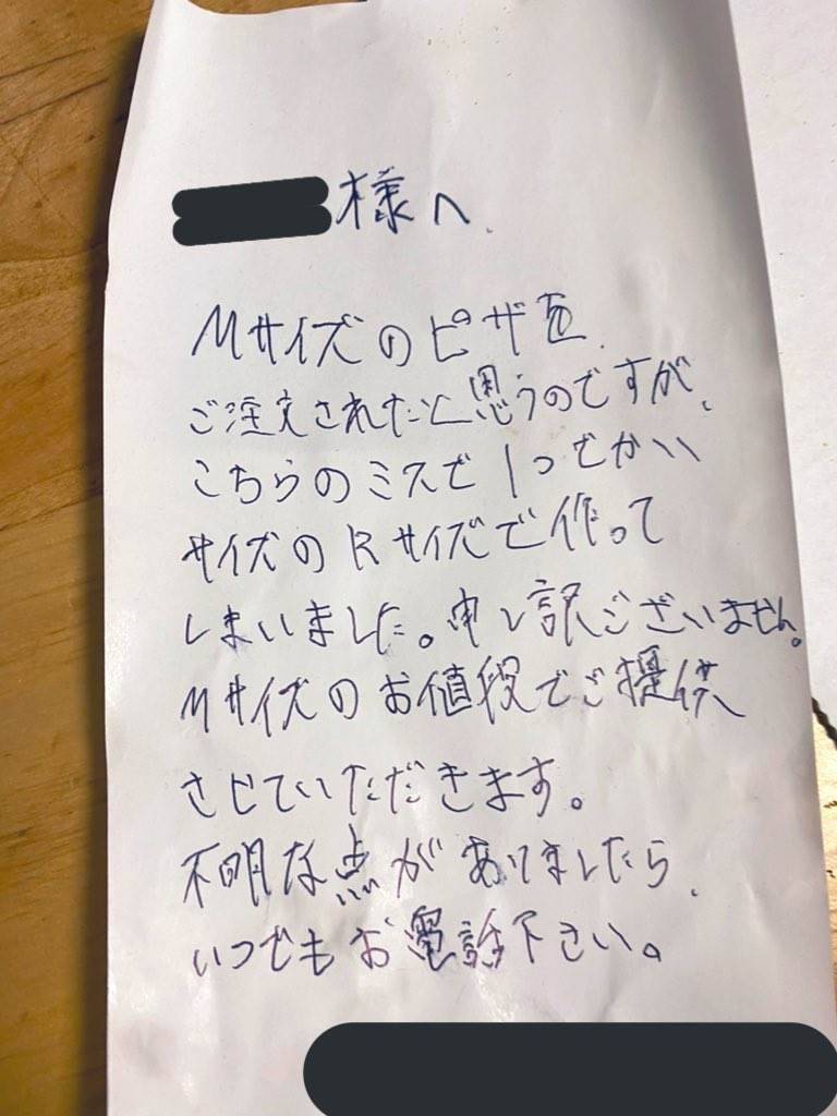 どうやらピザ屋さんがミスを犯してしまい、ピザに謝罪文を添えて配達してきたのだとか…
