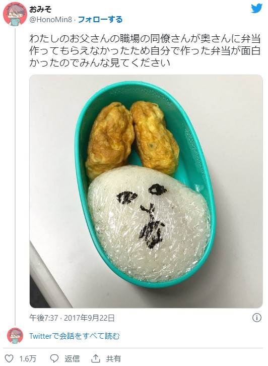 お父さんの職場の同僚の方が作ったお弁当なのですが、その日は奥さんにお弁当を作ってもらえなかったので自分で作ってみたそうです。
