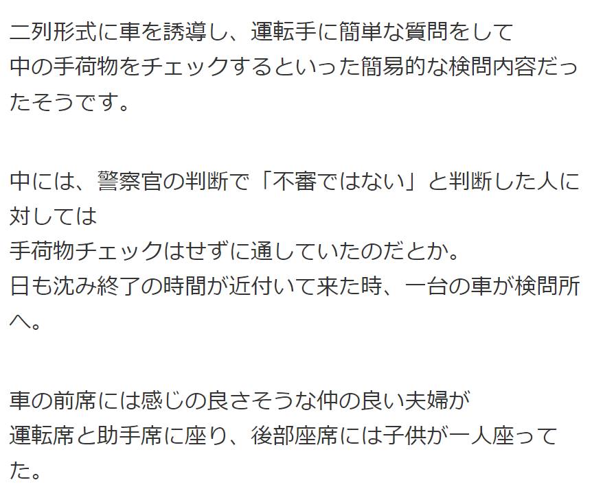 検問中、夫婦と子供が乗る車に違和感を感じた警官…