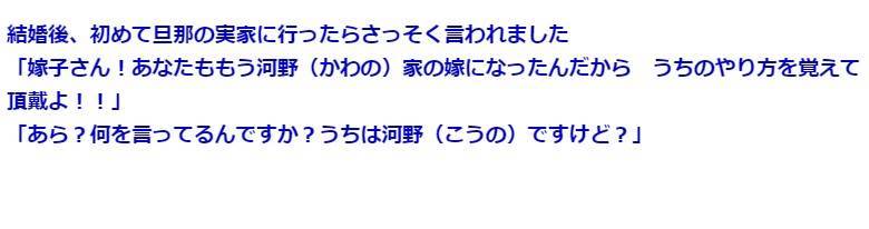 【苗字でDQN返し】トメ「嫁子!あんたはもう河野家の娘なんだから!うちのやり方を覚えなさい!」私「あんたは何を言ってるんだ?うちはもう河野なんだが?」トメ「」