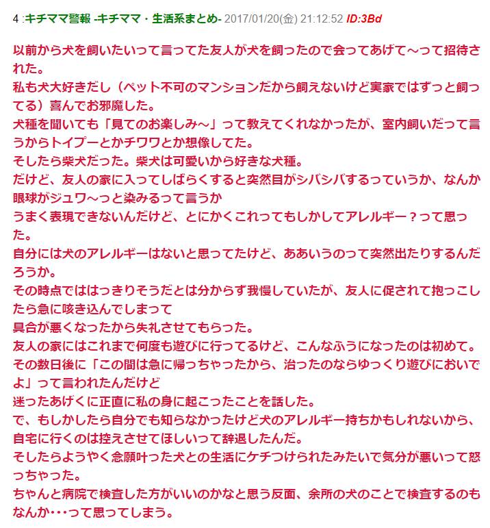 友人が犬を飼ったので見に行くと、アレルギー反応が出た。→後日、私「犬アレルギーかもしれないから、もう自宅には行けない」友人「気分悪い」