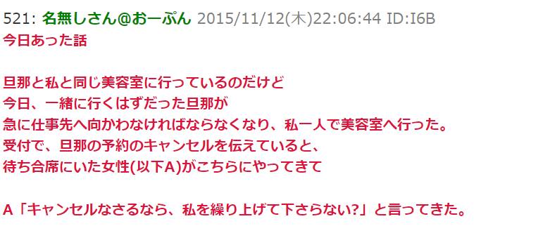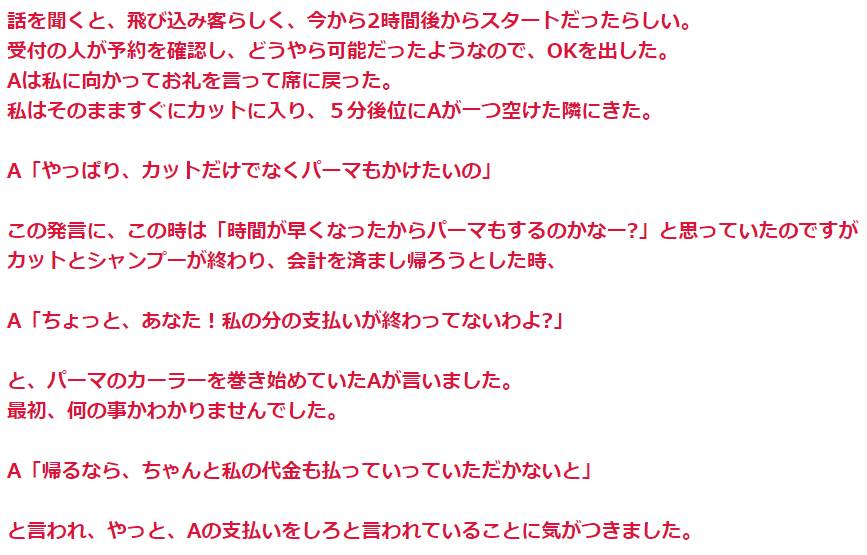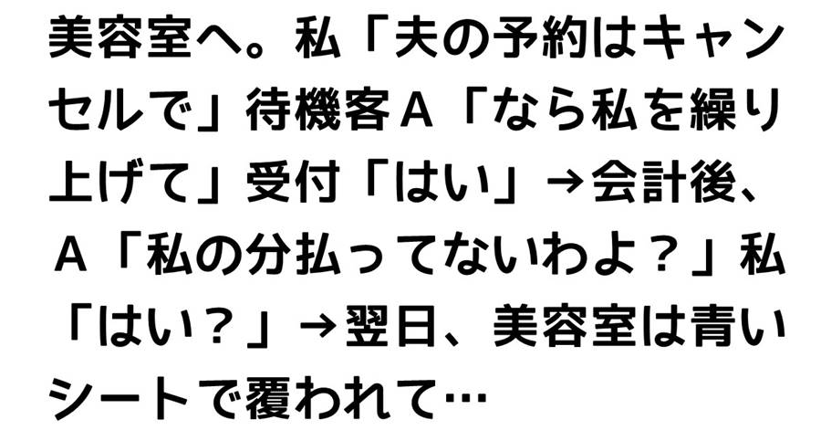 美容室へ。私「夫の予約はキャンセルで」待機客A「なら私を繰り上げて」受付「はい」→会計後、A「私の分払ってないわよ?」私「はい?」→翌日、美容室は青いシートで覆われて…