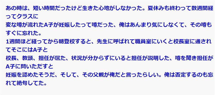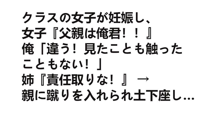 クラスの女子が妊娠し、女子『父親は俺君!!』俺「違う!見たことも触ったこともない!」姉『責任取りな!』 → 親に蹴りを入れられ土下座し…