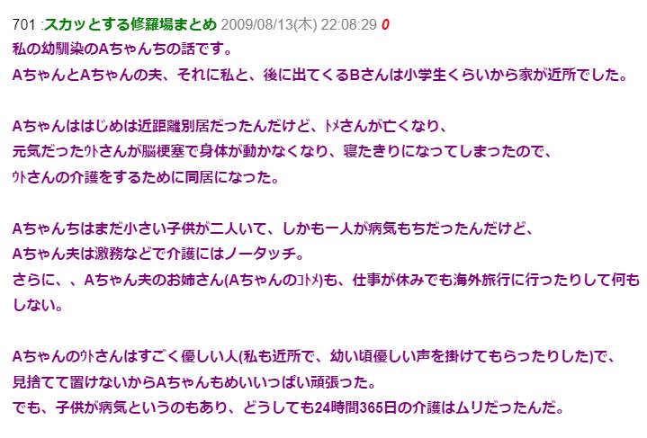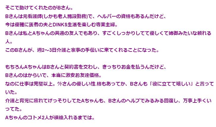 子供が病気で、脳梗塞の良ウトの介護にまで手が行かなかった時に元看護師のBが助けてくれる事に。ところが、コトメが「お金の無駄」「遺産が減る」と言ってBを出禁に。結果…