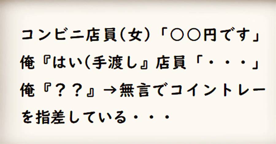 コンビニ店員(女)「○○円です」俺『はい(手渡し』店員「・・・」俺『??』→無言でコイントレーを指差している・・・