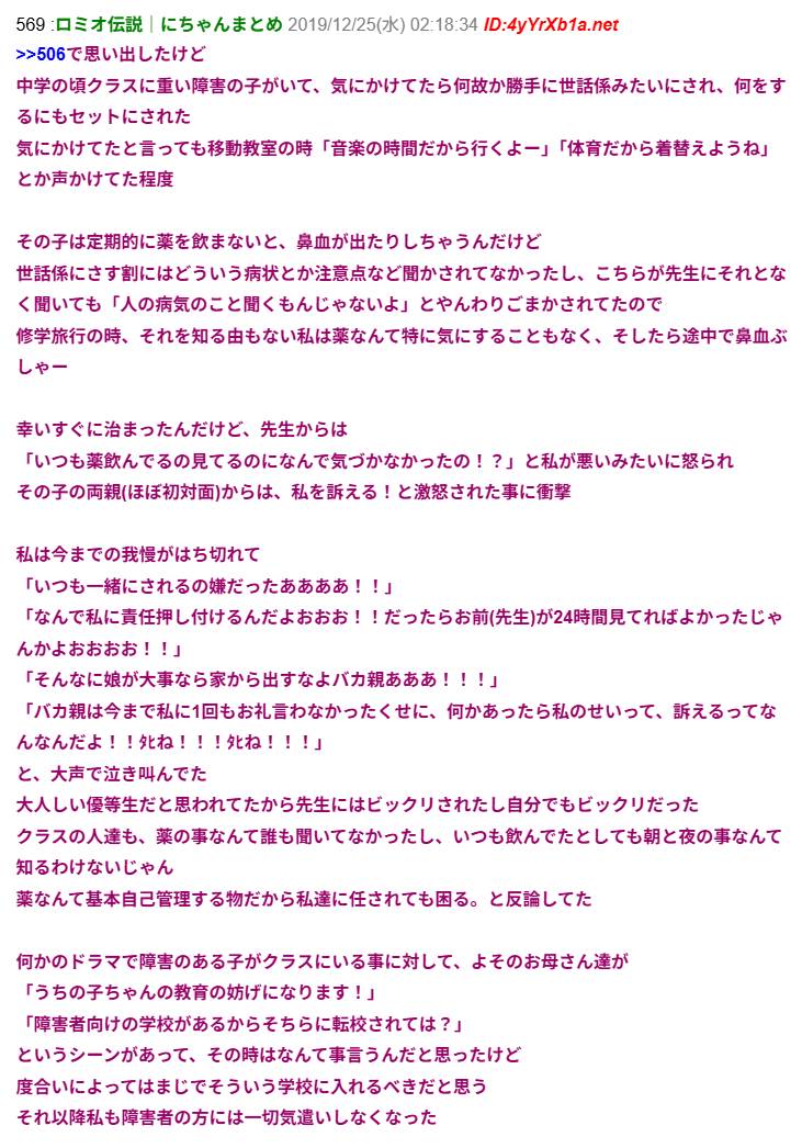 中学の頃、勝手に担任からクラスにいた重い障害の子の世話係にされてた。その子が薬を飲み忘れて鼻血が出た時「なぜ気付かなかった!」と担任と親になじられブチ切れ!→結果