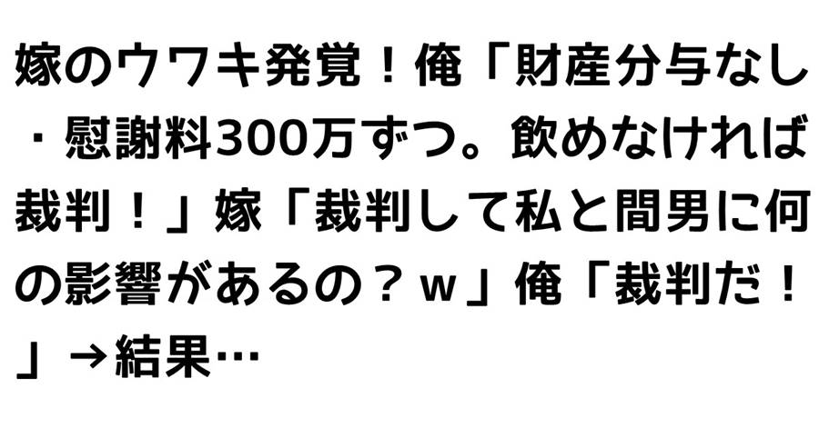 嫁のウワキ発覚!俺「財産分与なし・慰謝料300万ずつ。飲めなければ裁判!」嫁「裁判して私と間男に何の影響があるの?w」俺「裁判だ!」→結果…