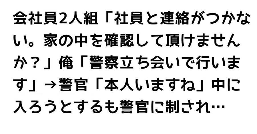 会社員2人組「社員と連絡がつかない。家の中を確認して頂けませんか?」俺「警察立ち会いで行います」→警官「本人いますね」中に入ろうとするも警官に制され…