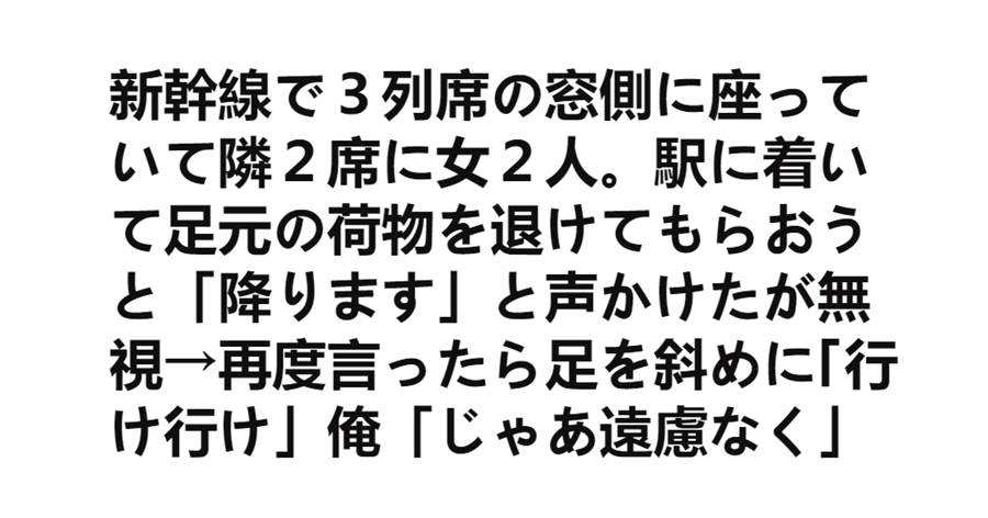 新幹線で3列席の窓側に座っていて隣2席に女2人。駅に着いて足元の荷物を退けてもらおうと「降ります」と声かけたが無視→再度言ったら足を斜めに「行け行け」俺「じゃあ遠慮なく」