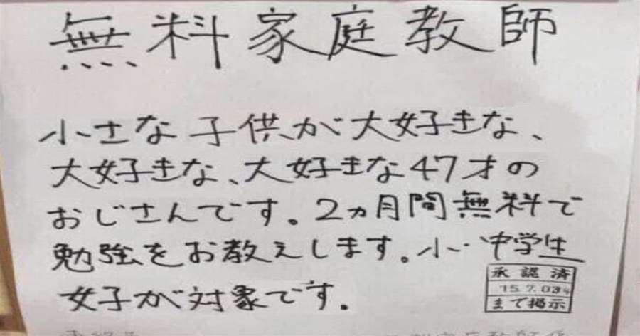 【無料家庭教師の貼り紙】小さな子供が大好きな47才のおじさんです。小中学生女子が対象です。