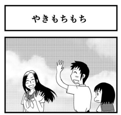 4コマ漫画「やきもちもち」 うん、そうだよ。 勝手に比べて、勝手にやきもちしてるだけ。 バカみたい、私。 \(^o^)/